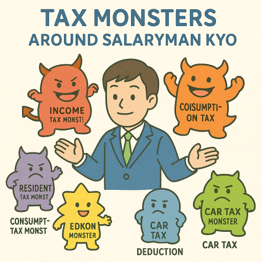 「給料から勝手に引かれてるアレ」「買い物するたびについてくる10%」――。日本で暮らす以上、税金からは逃れられない。でも実際、自分がどんな税金をどれくらい払っているのかって、ちゃんと理解してる人は少ないんじゃないかな?俺も含めてね(笑)。今回は、普通のサラリーマン(持ち家あり・車あり)を前提に、税金の全体像を分かりやすく整理してみたよ。