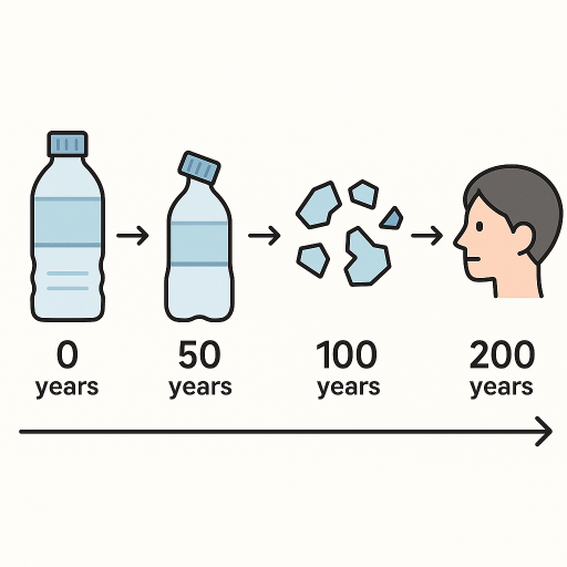 - 100年後:ボトルは粉々になってマイクロプラスチック化。