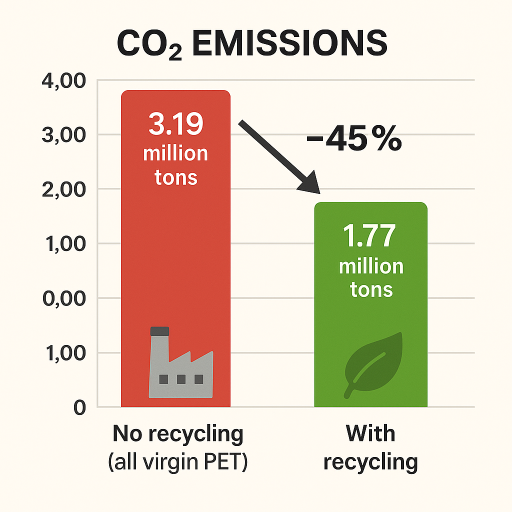 LCA(ライフサイクルアセスメント)っていう「製品が生まれてから捨てられるまで全部込みで環境影響を測る」方法で計算すると、日本のリサイクルで年間142万9千トンのCO₂を削減してるらしい!つまり新品石油から作って全部燃やした場合に比べて、約45%減。 CO₂削減イメージ図