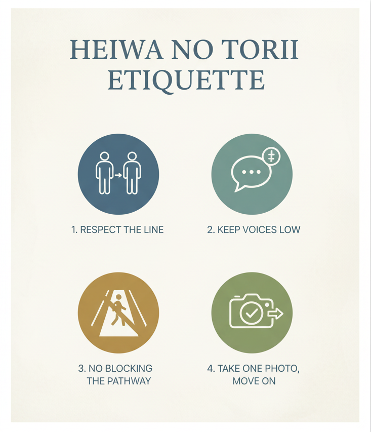 3. 平和の鳥居…行列があれば静かに待つ。鳥居=神域ゲートという自覚を一枚の写真に。