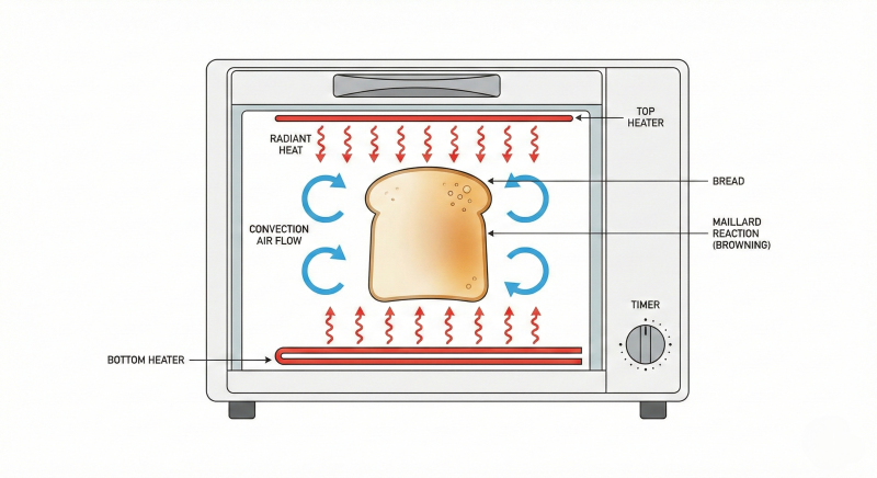 …そして今日も変わらず、ぼくらを焼き立ての香りで釣ってくる。ずるい。強い。 図:トースターの「熱の攻め方」イメージ(画像生成用プロンプト)