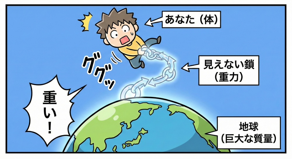 だから地球は、ぼくらの体を常に「地面の方向」に引っ張ってる。ぼくらが浮かないのは、地球に嫌われてるとかじゃなくて、地球が真面目に仕事してるだけ。