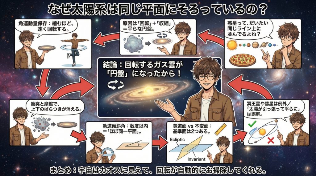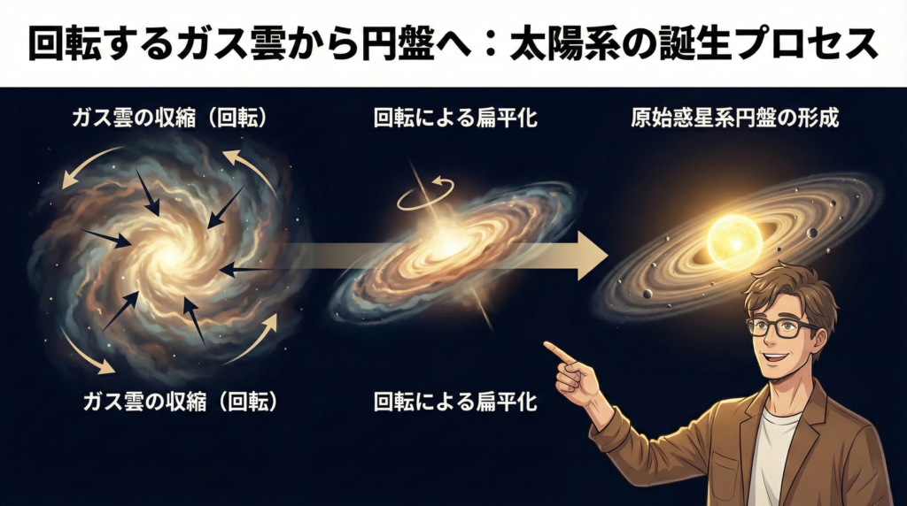 まず結論:太陽系が平たいのは「回転するガス雲 → 円盤」だから