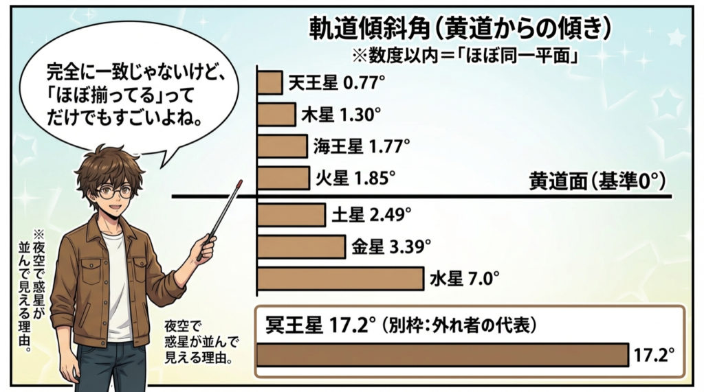 惑星の軌道が、地球の公転面(黄道面)からどれくらい傾いているか(軌道傾斜角)を並べると、雰囲気が一発で分かります。