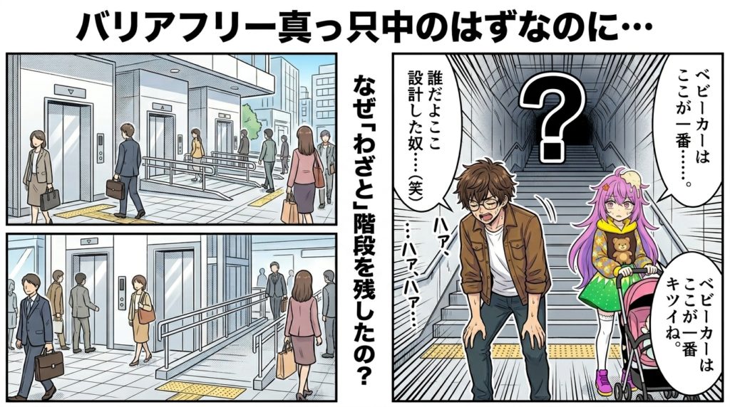 最近はどこに行っても「バリアフリー」が当たり前。エレベーターやスロープが整備されて、移動が楽になったのは本当にいいことだと思う。でも、地下道に入った途端、その流れがピタッと止まる場所があるじゃない?「なんでここで急に階段なの!?」って。