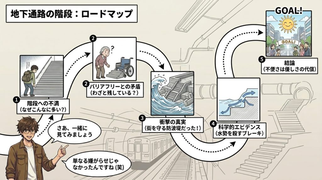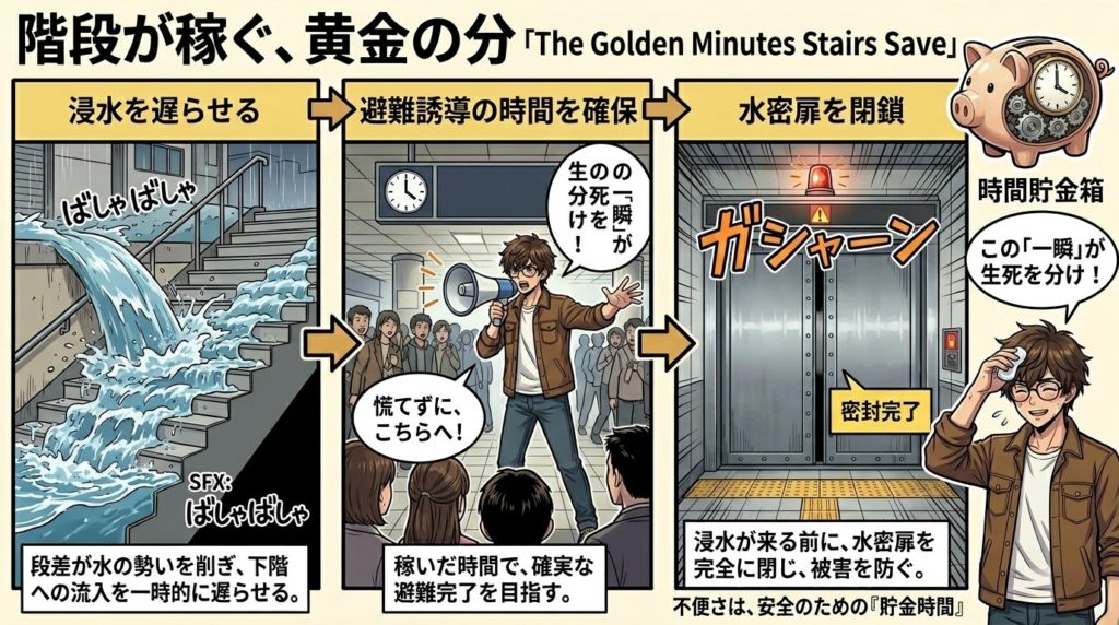 階段が浸水の速度を遅らせてくれる。その「数分間」の猶予があれば、地下にいる人たちが避難できるし、駅員さんが止水扉を閉めることもできる。 キョウ的に言わせてもらえば、階段は**「時間の貯金箱」**なんだよね。