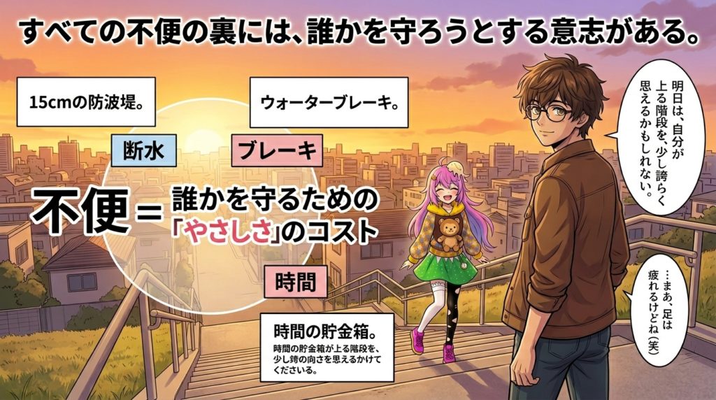 どうかな?次に駅の階段で「あー、面倒くさい!」って思ったら、ちょっとだけこの話を思い出してみて。 「ああ、この15cmの段差が、今この瞬間も街を守る準備をしてくれてるんだな」って。