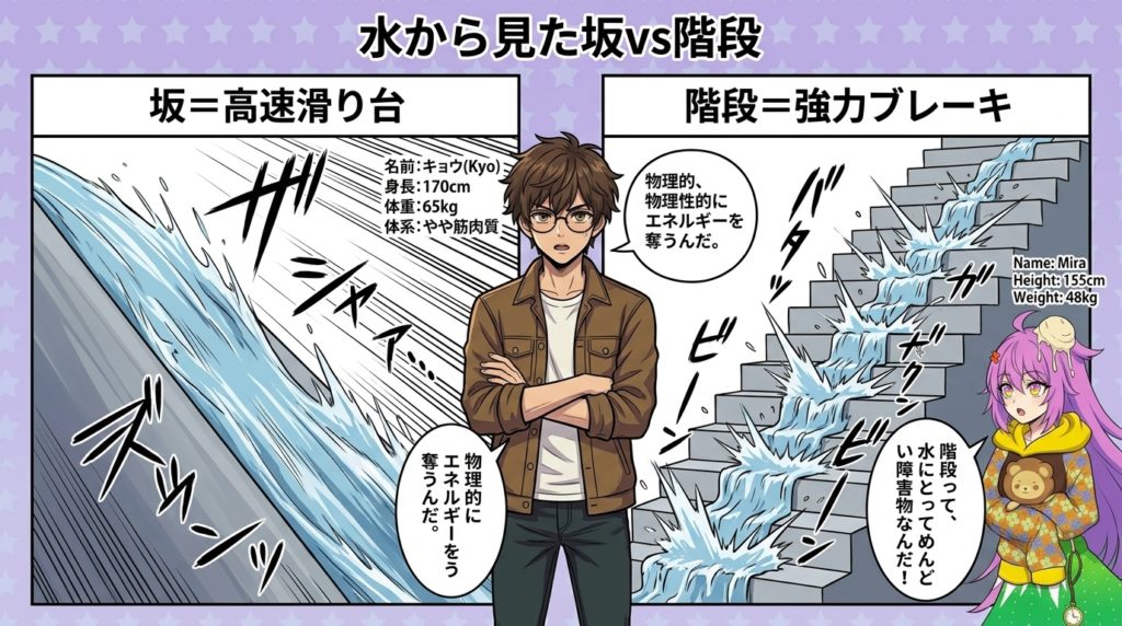 さらに面白いのが、物理学的な視点。俺、大学では物理を専攻してたんだけど(意外でしょ?)、水という「流体」にとって、階段はエネルギーを削る「ブレーキ」になるんだ。